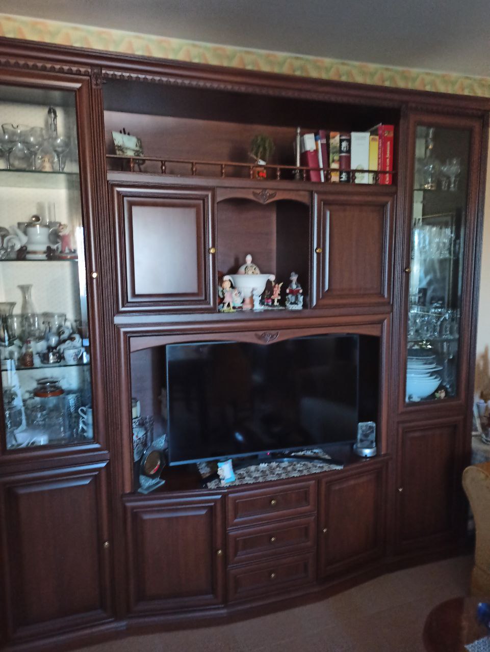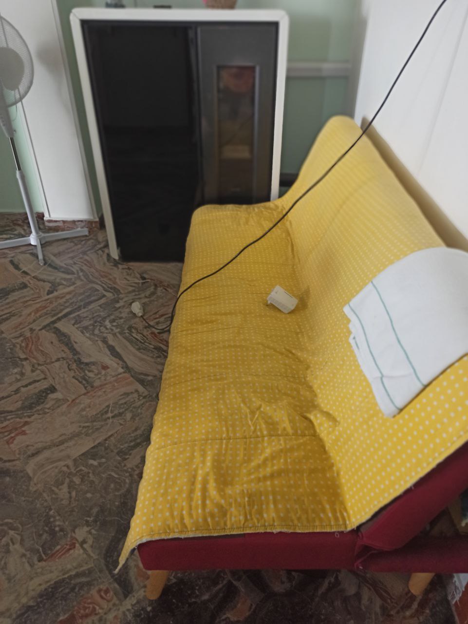 Televisore UNITED - Divano a due posti in simil pelle color marrone - Stufa a pellet marca RAVELLI ............. |