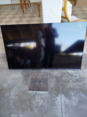 Televisore UNITED - Divano a due posti in simil pelle color marrone - Stufa a pellet marca RAVELLI ............. |