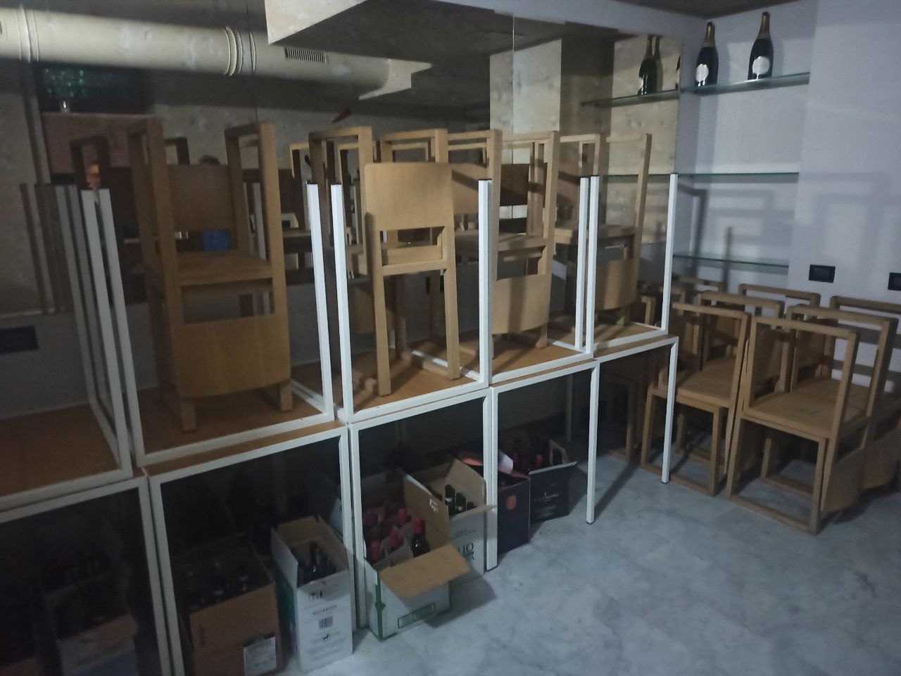 Arredi e numerose bottiglie di vino |